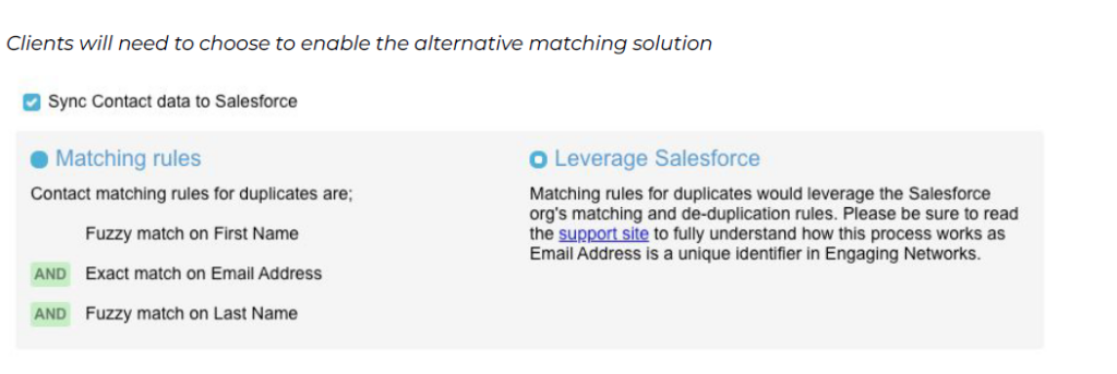 An admin can now go to Data & Reports > Salesforce > Settings and look underneath ‘Matching rules’ to choose a preference.