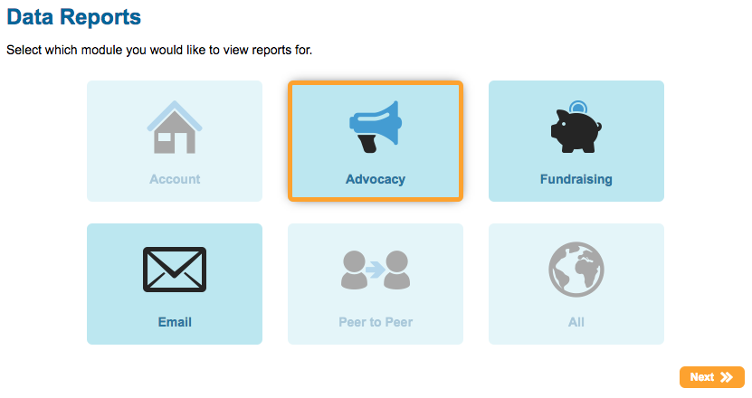 There are currently three types of data reports: Advocacy, Fundraising and Email
