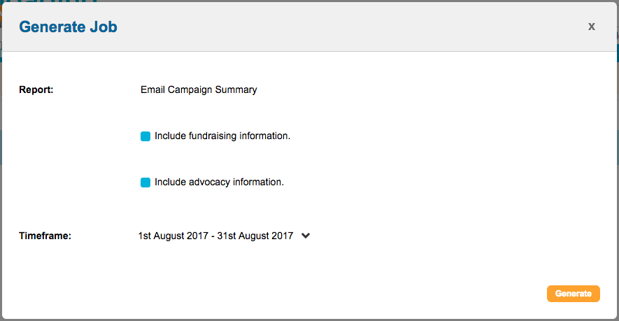 The file will contain summary data for all the message sent during the timeframe you chose and fundraising and/or advocacy information generated by those emails if you ticked the box to include it.