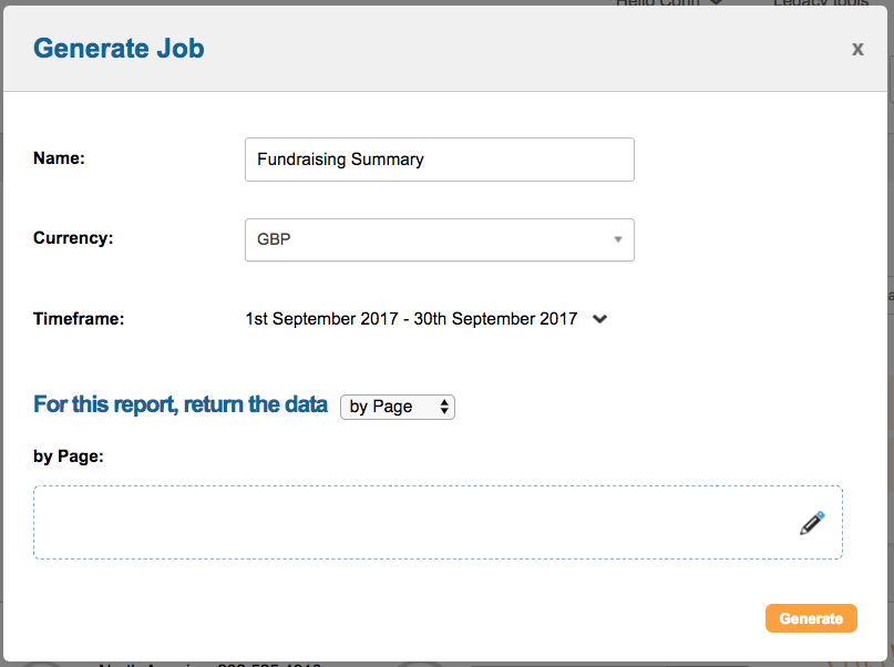 by Page, which allows you to select the type of pages you want to report on, or you can select all fundraising pages. Note that legacy pages cannot be filtered on, but are reported on if you choose to report on all pages