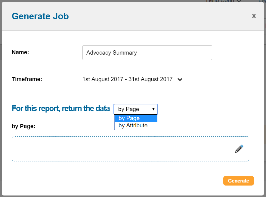 by Page, which allows you to select the type of pages you want to report on, or you can select all advocacy pages. Note that legacy pages cannot be filtered on, but are reported on if you choose to report on all pages