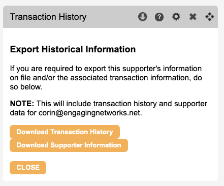 - Download Transaction History – this will download every transaction for the supporter in the transaction format