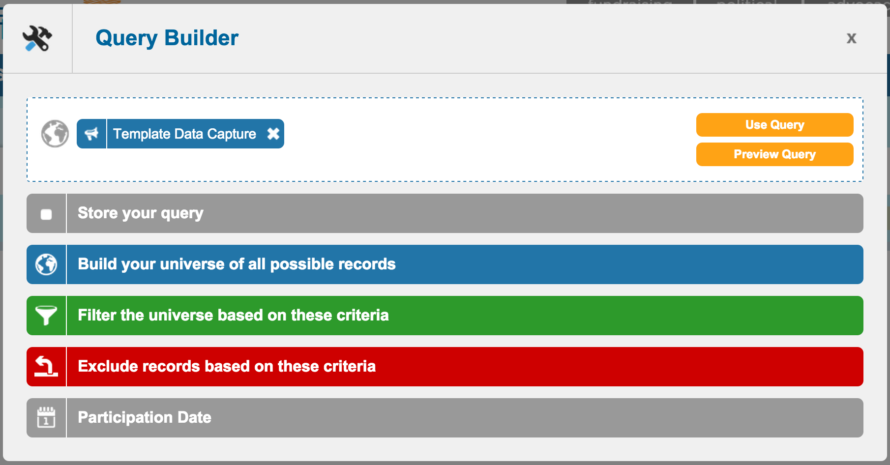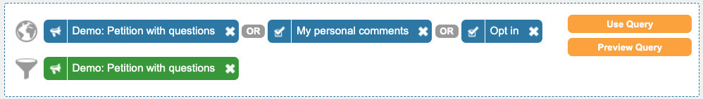 - If include filters are included, run these filters and then retain from the universe only those specified in the include filters. If no filters were specified in the universe, then we simply proceed with the list of supporters from the include filters.
