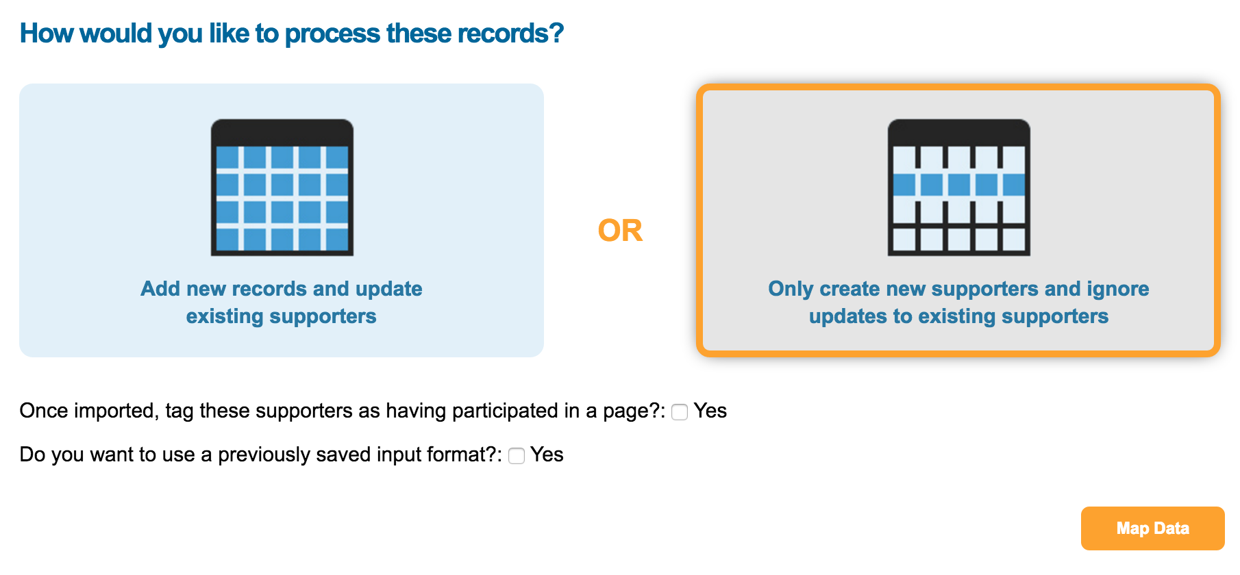 Only create new supporters and ignore updates to existing supporters: This option will only create new supporters. For any email addresses that already exist in the account, it will ignore those data rows and not update the records.