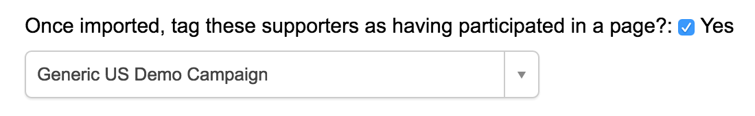 There is an option to tag supporters as having participated on a page as part of the import. When enabled, an additional dropdown will become available to select the live page where the participation should be recorded. Participations can also be imported as columns in the import file and mapped to the relevant page.