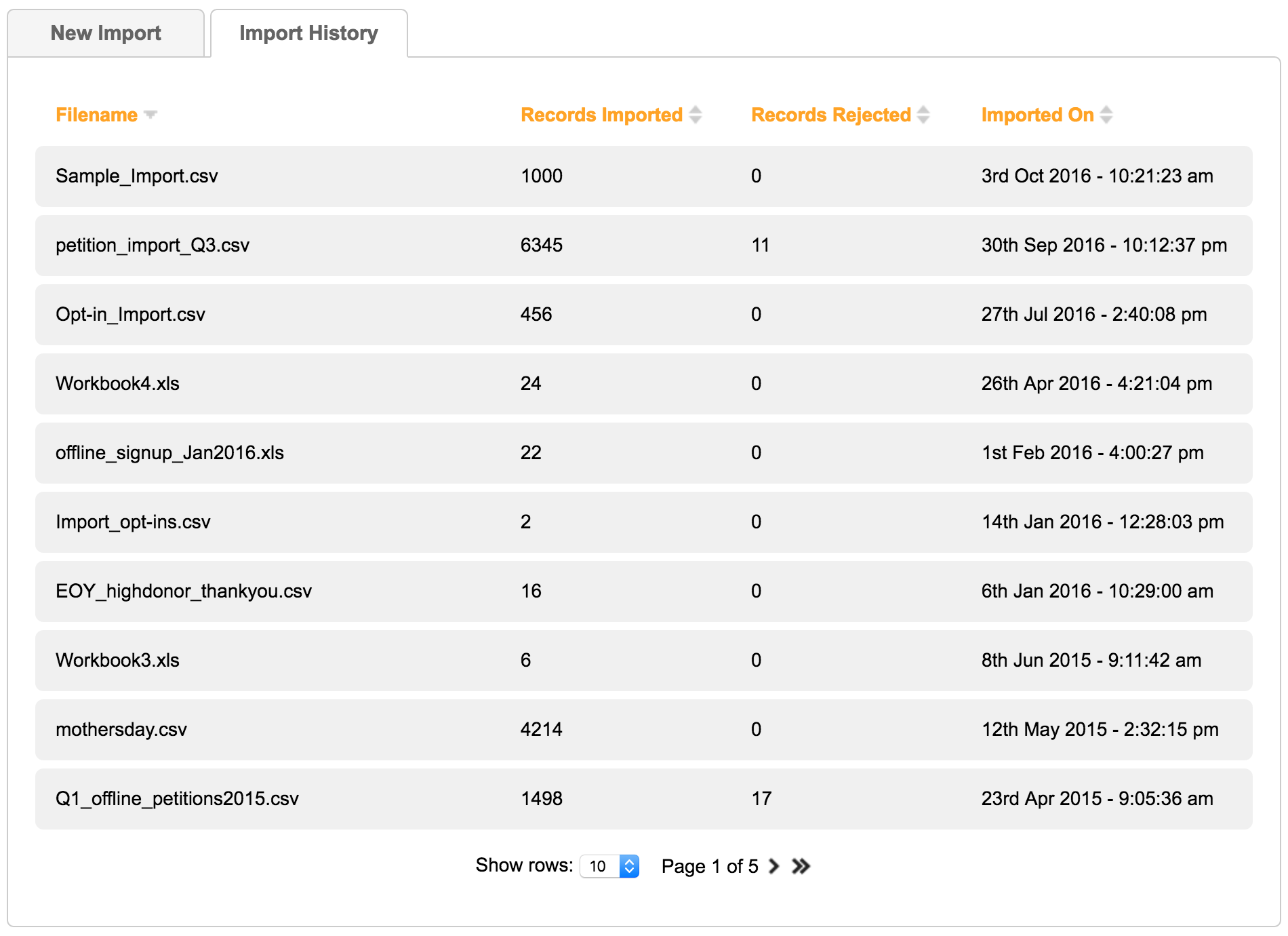 Under Data & Reports > Import, there is a Import History tab to view a list of files that have been imported. File name, imported record count, rejected record count, and import date are available from this tab. The Job monitor also includes a history tab to see a log showing how many records were successfully imported.
