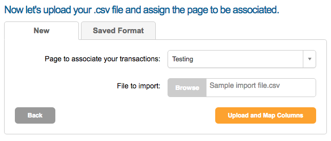 You’ll now be taking to a screen where you’ll need to choose the donation page you want to import these gifts into and your CSV file. For more information about the file format please see here.