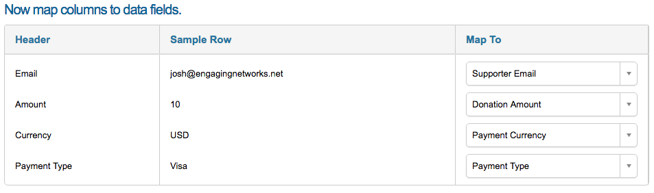 You’ll now be taking to a screen for mapping your csv file data with the columns in your database. The software will do predictive mapping if the header row names match the transactional field names. It will also show a sample of the mapping based on your first row of data in the file.
