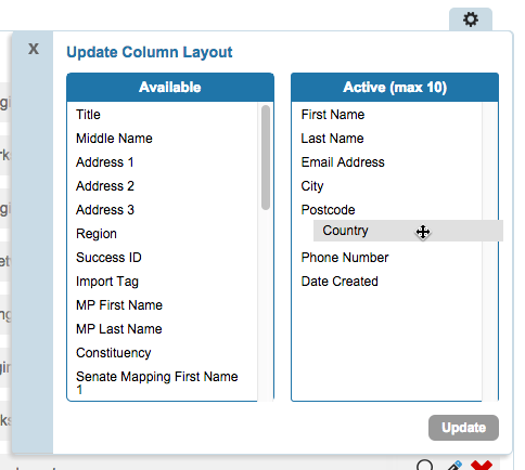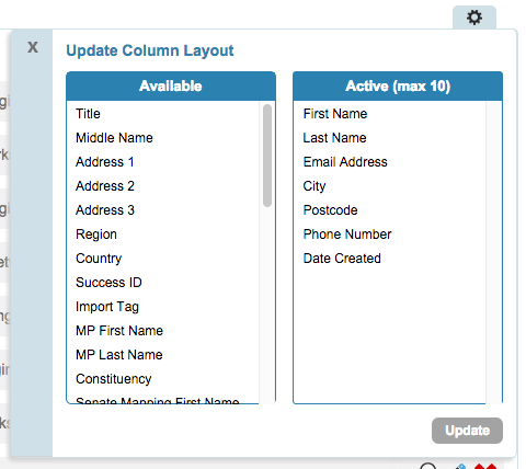 You can customize which supporter fields and opt-in questions are displayed by clicking on the settings icon