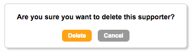 When deleting a single record or multiple, you will need to confirm that you want to delete the supporter records before they are deleted by clicking “delete” from the pop up message.