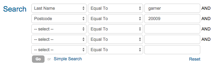 Build a query using up to five supporter record fields to refine your search even more. Each new field is treated as an “AND” statement in your query, so the supporter record must meet each search criteria.