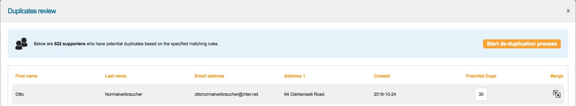 Within the software, a ‘record’ is identified by the email address associated with it – this is in effect used as the unique identifier for each supporter/constituent record within your database. A duplicate is an instance where multiple records exist for what is seemingly the same individual. Such duplicates can occur for a multitude of reasons, including mis-typed email addresses upon page submission, old email addresses that are no longer in use and so on. De-duplication is a way of tidying up your data, so it only contains records that are actually valid, and disposing of the records that are old or invalid, but retaining any transactions associated with those records.