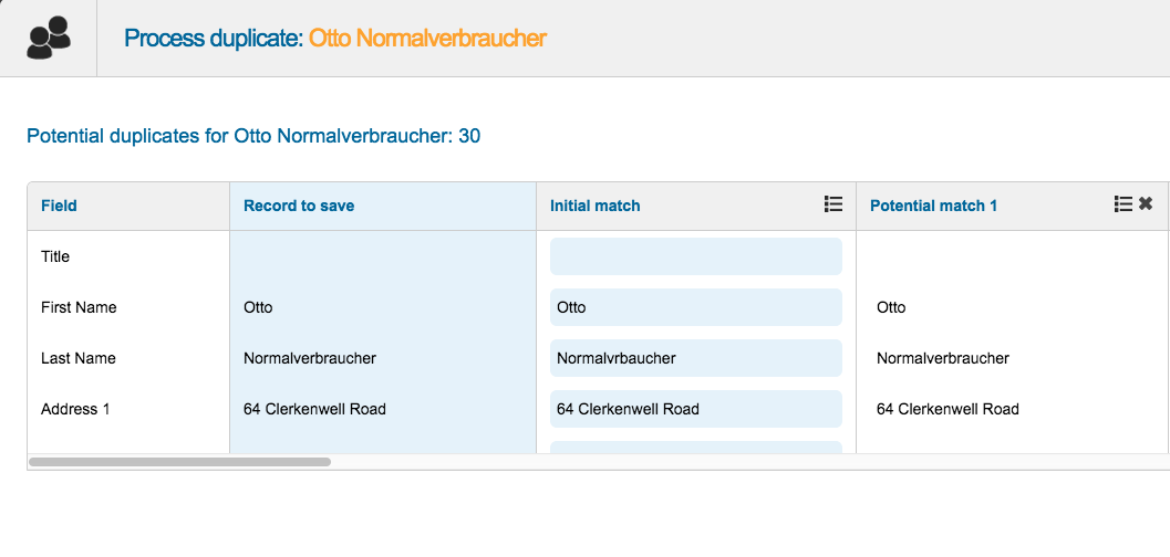 Looking at a record with potential duplicates, the ‘Initial match’ will be the record we are currently working on. Each potential match will be displayed as a separate column, but matches are not returned in any particular order, so review each potential match carefully before you decide which action to take.