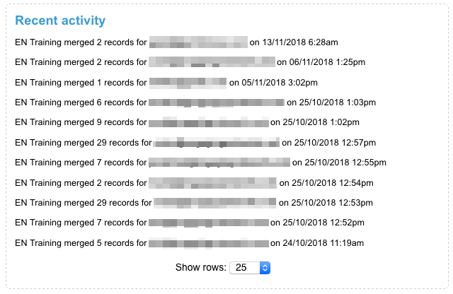The service will run every night to identify more potential duplicate records in your account. A maximum of 1000 newly identified records will be added to the queue on each run. After the first run, you should have a few matches and can begin processing them. Any user with access to this function is able to process duplicates, and you will see an overview of the most recent activity on the Duplicate management landing page. The overview includes information about which of your users processed a duplicate, as well as which record was affected.