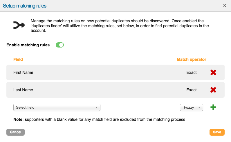 Click on ‘Set up rules’ under ‘Matching rules’ to start setting up the service to identify potential duplicate records. Once you have turned on the ‘Enable matching rules’ switch, you will need to decide which fields in your account’s data structure will be checked to identify individuals, then decide whether you want this to be an exact match or a ‘fuzzy’ match. You can add multiple fields, which will always match with an ‘AND’ logic (which means they have to obey every rule to be a match). Any supporter with a blank value in any of the match fields will always be ignored, and will not constitute a match.