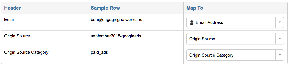 If you would like to store “Origin Source” you will need to import a file with that contains the columns ‘Origin Source’ and ‘Origin Source Category’. For information about formatting your file for import see here. Once you have created your import file you can user the import tool to import the supporters and map their ‘Origin Source’. A sample file is shown below:
