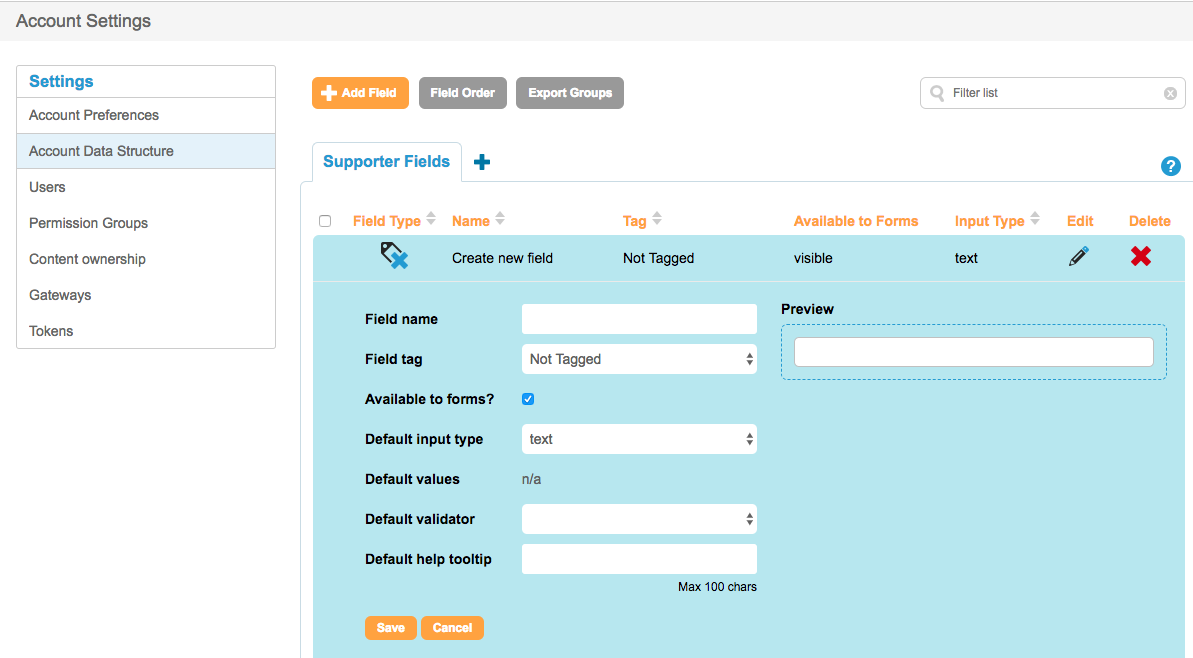 Before you start mapping your data you will need to create the extra database fields in your ‘Account data structure‘, if you haven’t done so already. For example, if you want to map US Representative data to your supporter data, you will need to create up to 5 extra columns, for Representative title, Representative first name, Representative last name, Representative constituency and Representative party. You’ll need to go to the ‘Account Settings’ section of the software and click on ‘Account Data Structure’ then ‘+ Add Field’ to add the additional data fields.