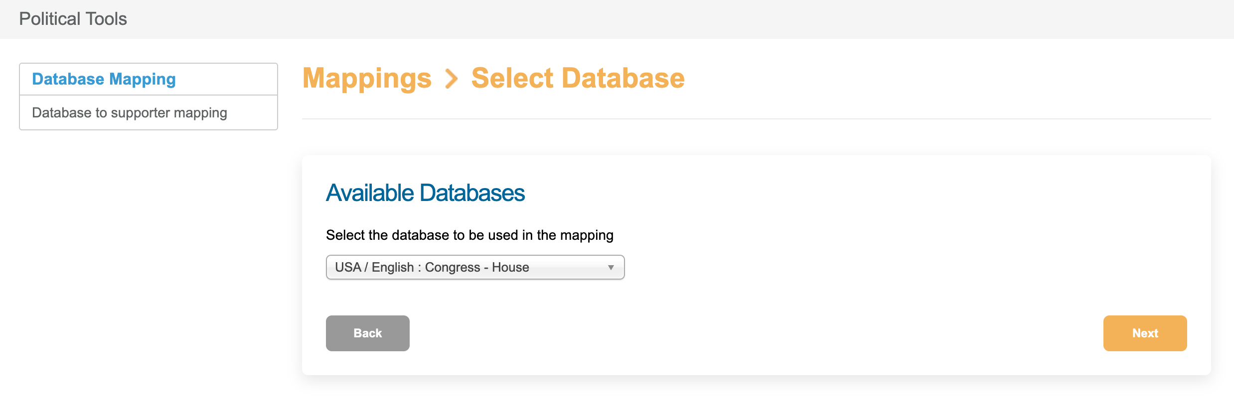To do that, go back to the Data & Reports > Political Tools > Database to supporter mapping page.