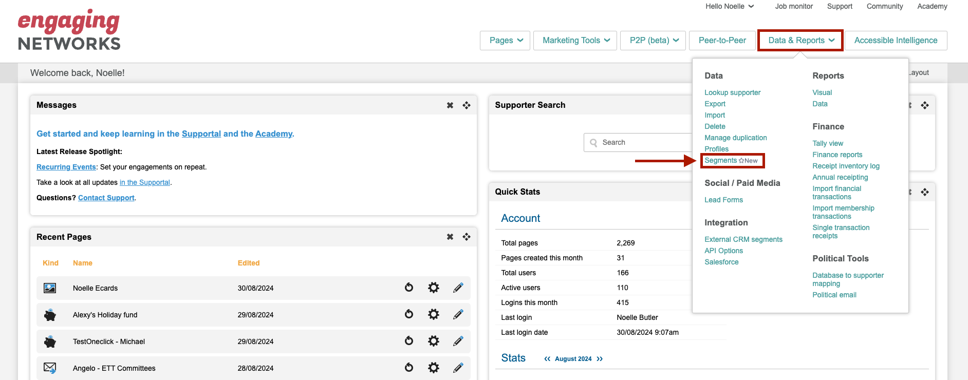 Segments are a robust and dynamic tool for categorizing supporters and building lists within your organization’s file. Taking elements from the legacy Query Builder and Profiles tools, Segments are a powerful new way to view and analyze your organization’s data. This resource will explain how to navigate and use Segments within Engaging Networks.