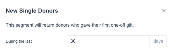 In the New Single Donors segment you can customize how many days back you want the segment to look at to find new single donors.