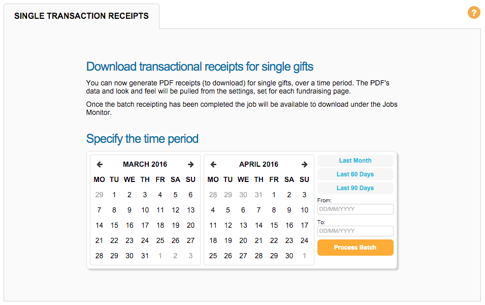 The “Single Transaction Receipts” tool enables you to generate PDF receipts for download within a specified date range, up to 90 days prior. Receipts will be generated for any single gift donation page that has a receipt template attached to the “thank you” email.