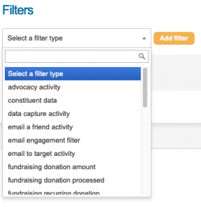 Activity type – “Any advocacy activity” will include submissions made to a Data Capture, Petition, Email to Target, Tweet to Target, Click to Call or Survey page. “Email to target” just that page type. “Data capture” includes the page types Data Capture, Petition
