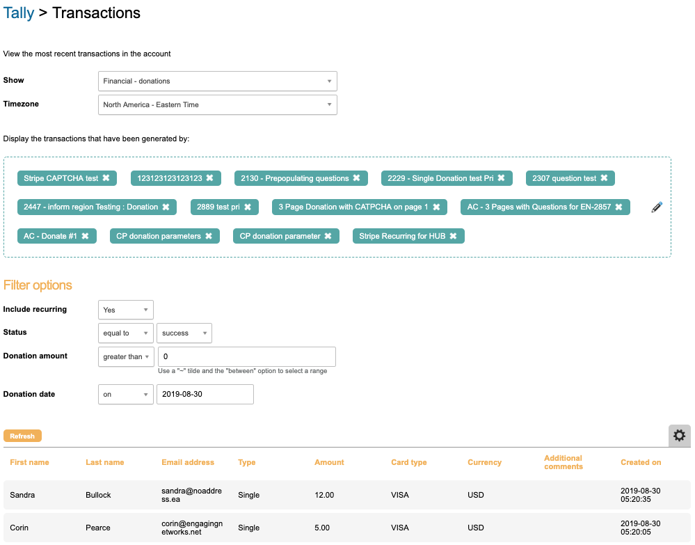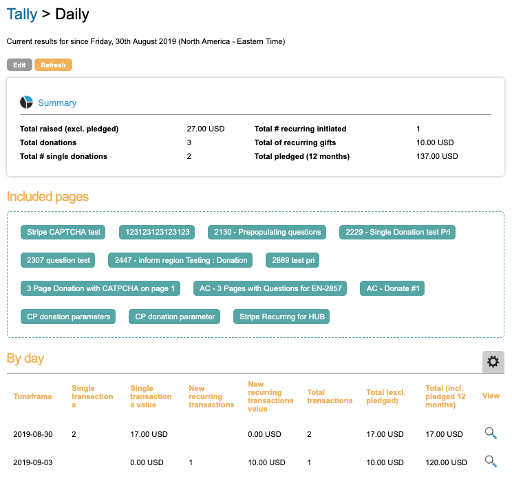 The Tally view report can be used to view recent donations from within the platform without having to download data via the query builder or by using financial reports.