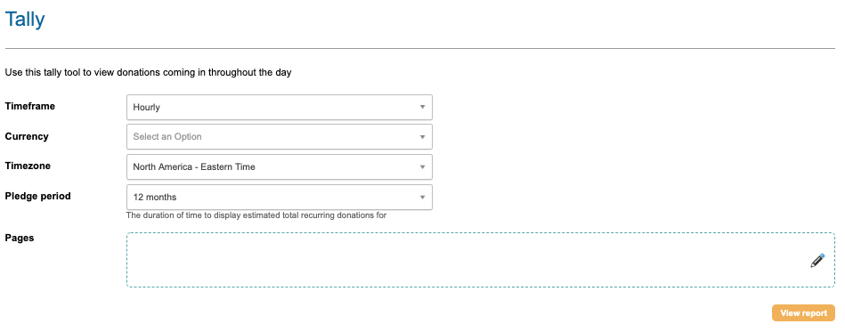 - Pages: What donation pages should be used in the tally view. Only Donation, Premium Donation and Ecommerce page types are available in this type of Tally report, although other page types are available in the Tally Transactions report (see below)