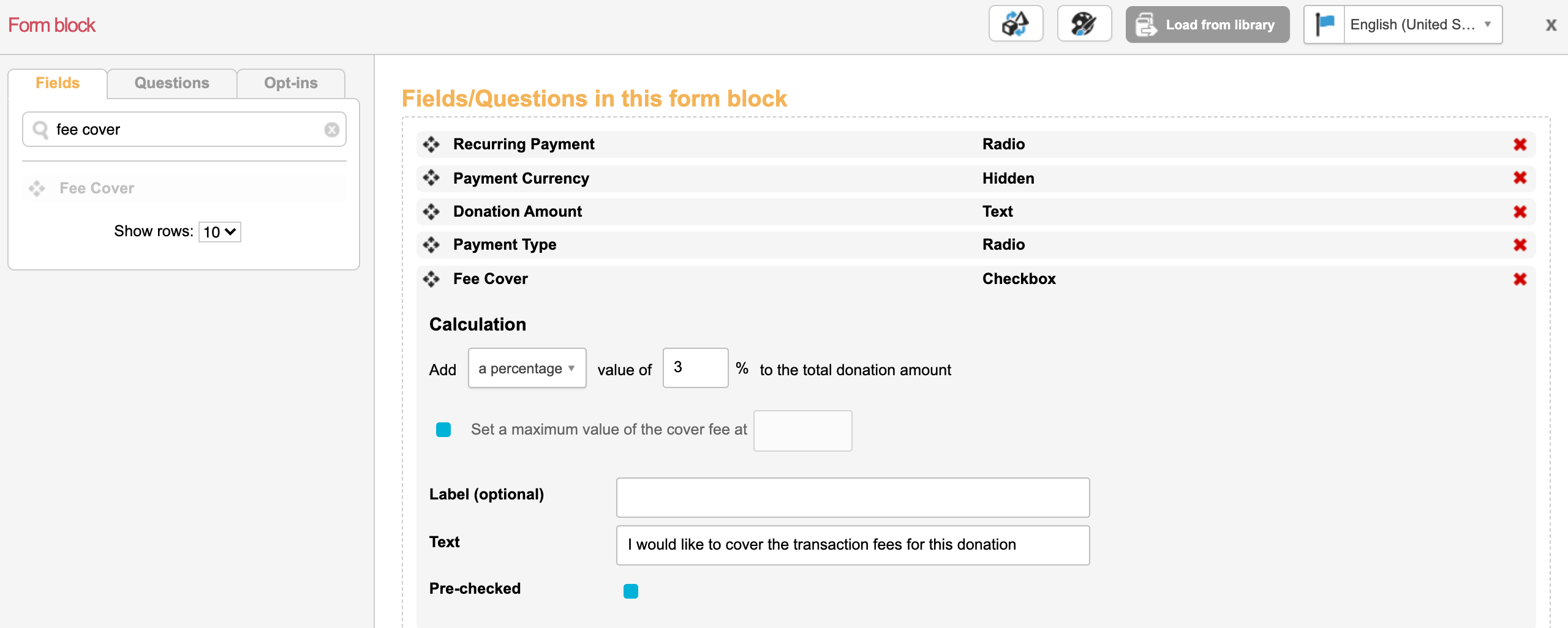 Add ‘Fee Cover’ as a form field and click to open and edit details.