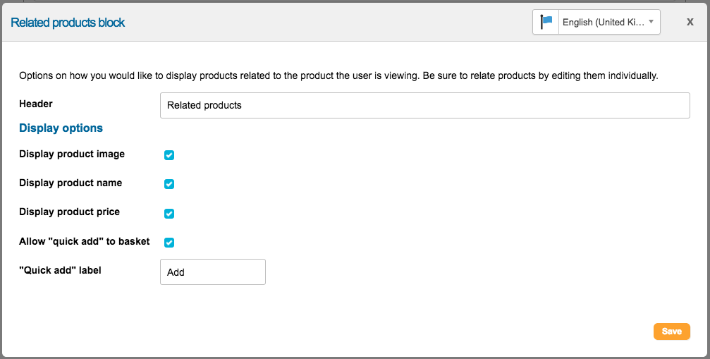 - You can choose whether you want the supporter to be able to “Quick add” the related product to their cart and what the label should be if so