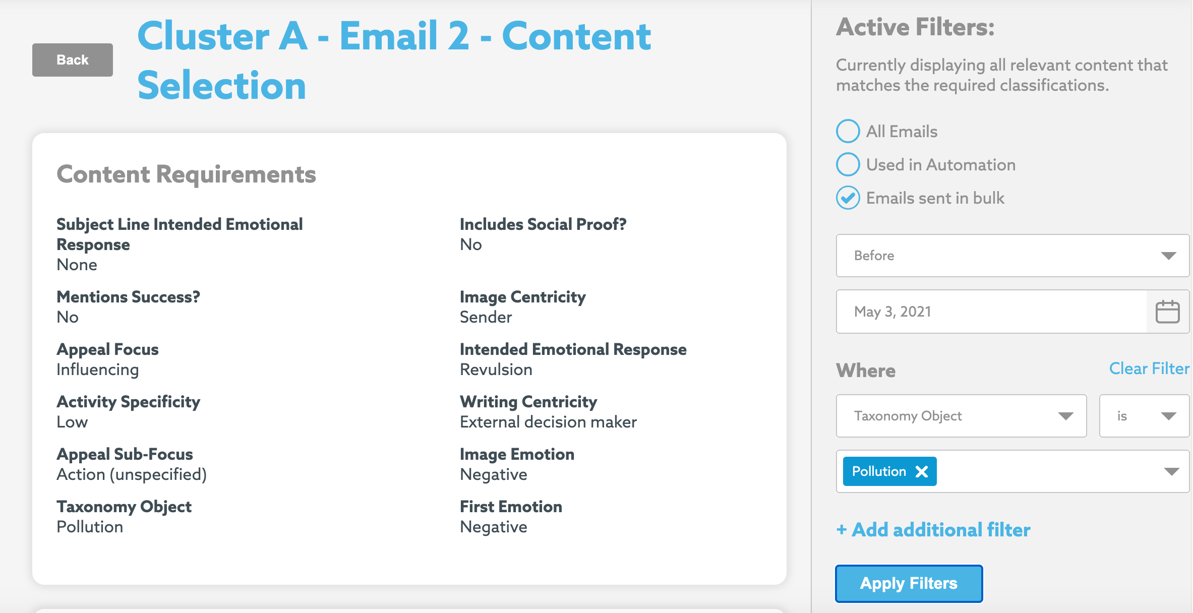 - Or, Filter based on the core criteria of the email, or the categories that would be most difficult to update from an existing email, such as the Taxonomy Object or Appeal Sub-Focus. When applying a filter, this will re-populate the email content available to select below, according to the filtered values.