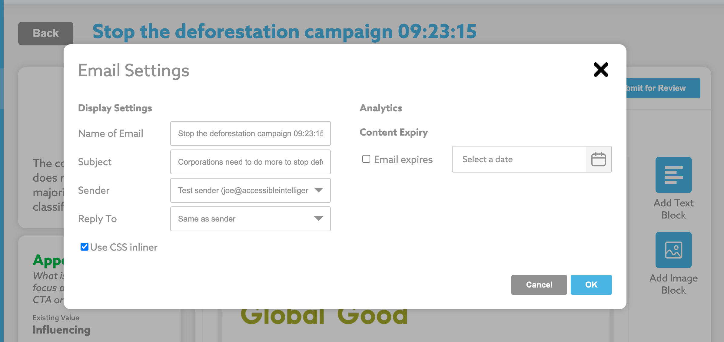 Update the subject line and sender details via the Settings button at the top of the email. Click OK to save any changes. You may also choose to set an expiry date to remind team members to update the content after a certain period of time. This will NOT automatically pause delivery of the content and will continue to serve unless the marketing stream is ended or the content is updated and approved.