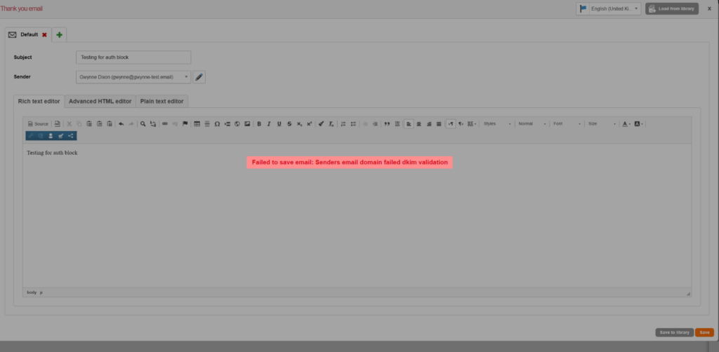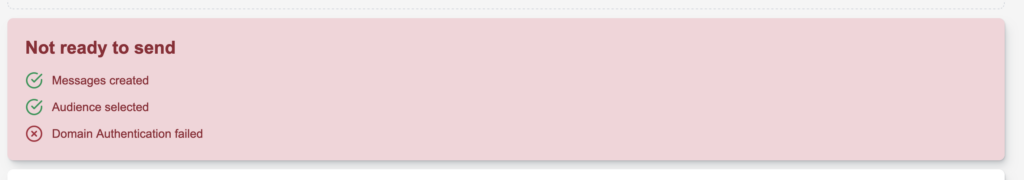 Emails cannot be sent with domains without DKIM and Return Path configured. The following errors will display if an unauthenticated sending domain is set as a sender.