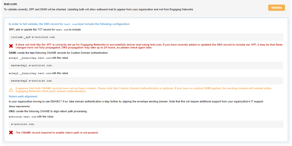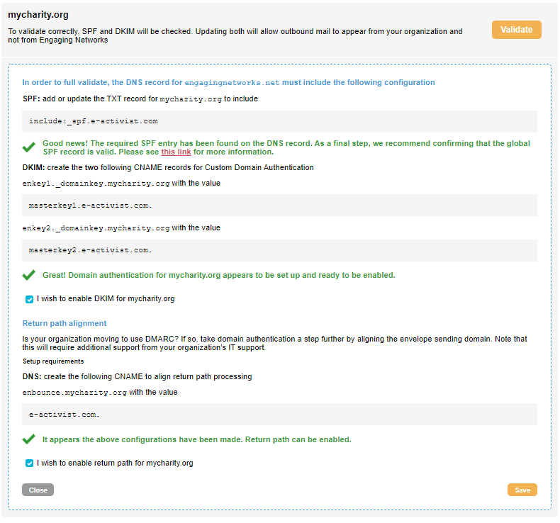 After propagation, validate the domain again in Engaging Networks to ensure all the records are configured correctly