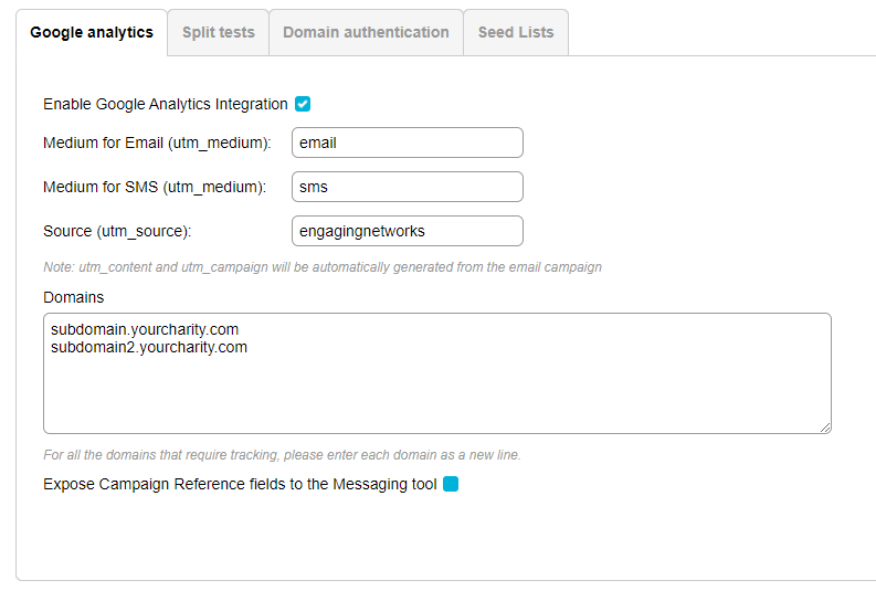 Set your domains – these will be your domains for pages that you want to enable this on. For example your Base URLs in Engaging Networks, plus any sites you might want to track (e.g. your homepage). Only domains set here will have the tracking added. Each domain needs to be on its line.