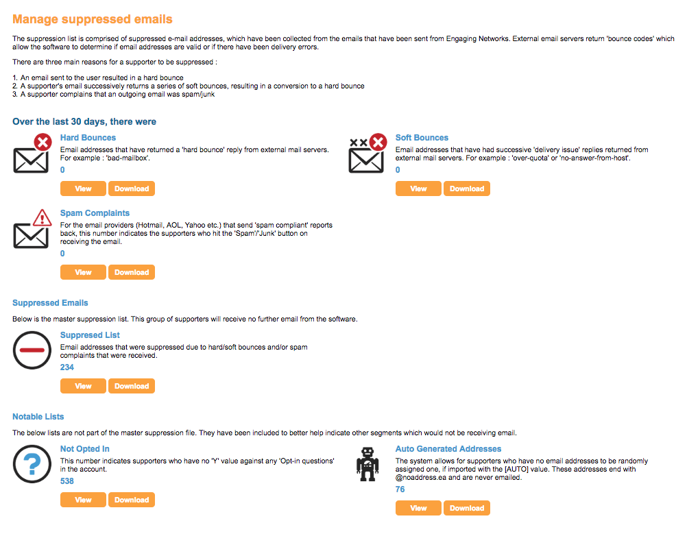 A suppression is an email address that has either hard bounced, seen a number of soft bounces or marked an email as spam. To maintain good reputations with the receiving server and protect email deliverability, suppressed supporters will no longer be sent emails.