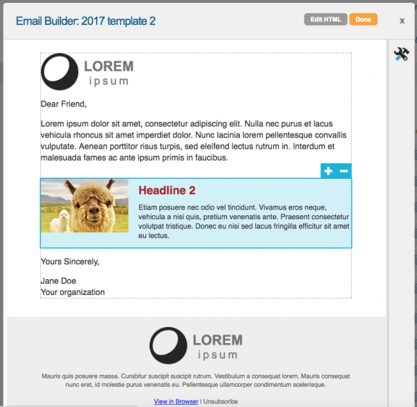 A text block is editable within the template, so when a user creates a new campaign they can hover over the text block to make changes. Therefore, if you don’t want an area to be editable (for example in the footer), then you will need to add the HTML manually in the HTML editor or remove the classes that identify it as editable.
