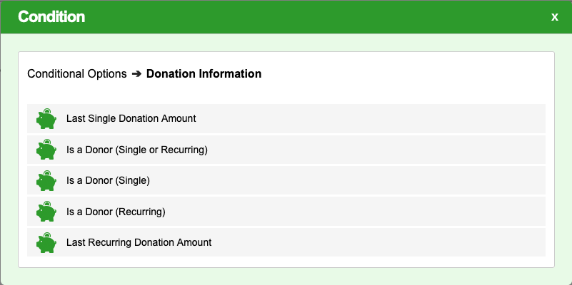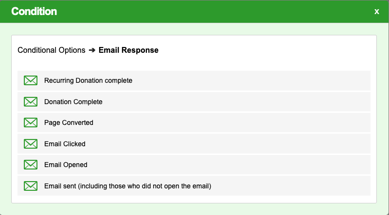 This type of condition will look at how a supporter interacted with an email sent out by the automation. You can look at whether a supporter completed a recurring donation, made a single donation, ‘converted’ via a page, e.g took any advocacy or other action they were invited to in the message, other than donating, and also whether they clicked on a link within the email or just opened the message. You can also set up a condition for supporters who were just sent the email, but did not even open it after they received it.