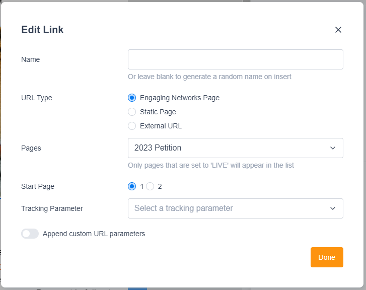 For a URL Type of “Engaging Networks Page”, this allows you to insert your own custom defined parameters to the campaign URL. This option will append the parameter and value you assign to the URL you’re inserting in the email.