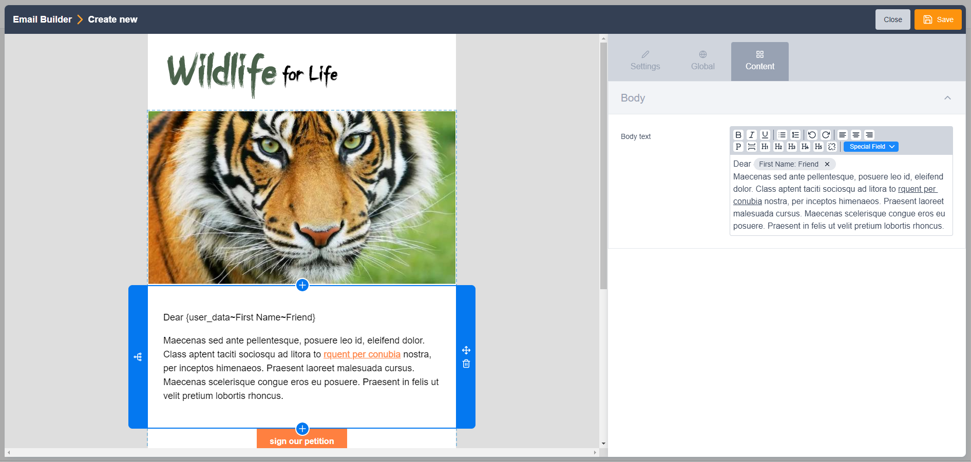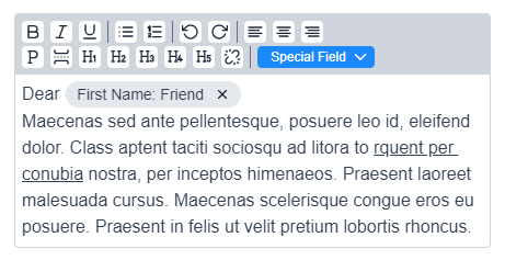 Subject – the subject of the email. Click “Special field” to insert User Data. These use fallbacks which kick in if the insert contains no data, for example “First name” with a fallback of “Friend” or “First name” with an entirely different fallback subject line with a User Data insert.