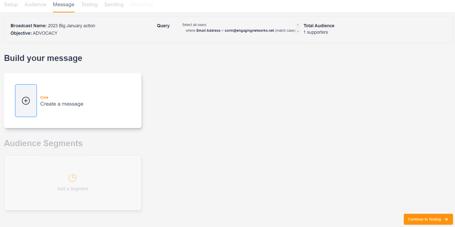 It will show a summary of Broadcast Name and Objective (set in Setup ), the selected Query or Segment (set in Audience), and Total Audience based on that audience as well as Suppressed supporters (who are selected but won’t receive the email). If a segment is used, there will be an option to preview the segment being used by selecting