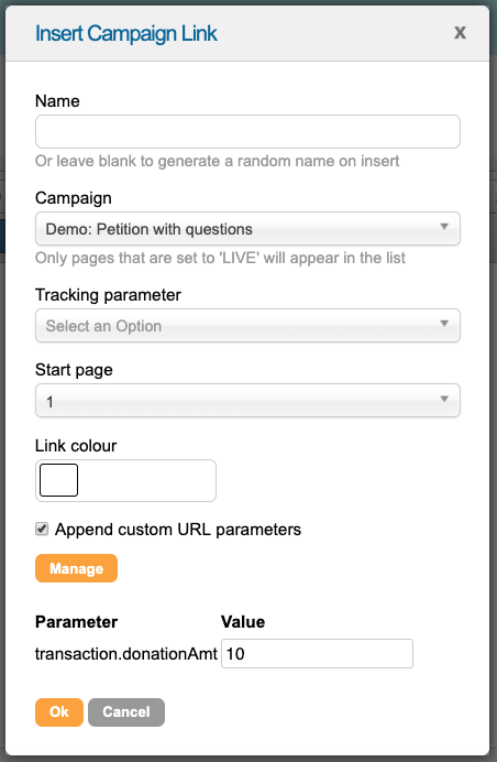 If you wish, you can also add URL parameters to your campaign links. These can be used to pre-populate additional data, for example a donation amount. If you want to add additional parameters, such as transaction.donationAmt=10 to force a different default donation amount, you can do so here.