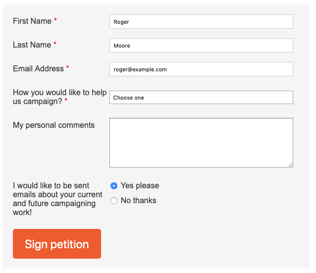 When your supporters open a campaign, it can be beneficial if their details are already displayed in the form fields. This is known as pre-population and will mean your supporters have less typing to do, and may be more likely to submit the page.