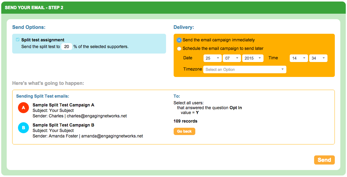 Once you have selected your supporters it’s time to choose when your email will be sent.