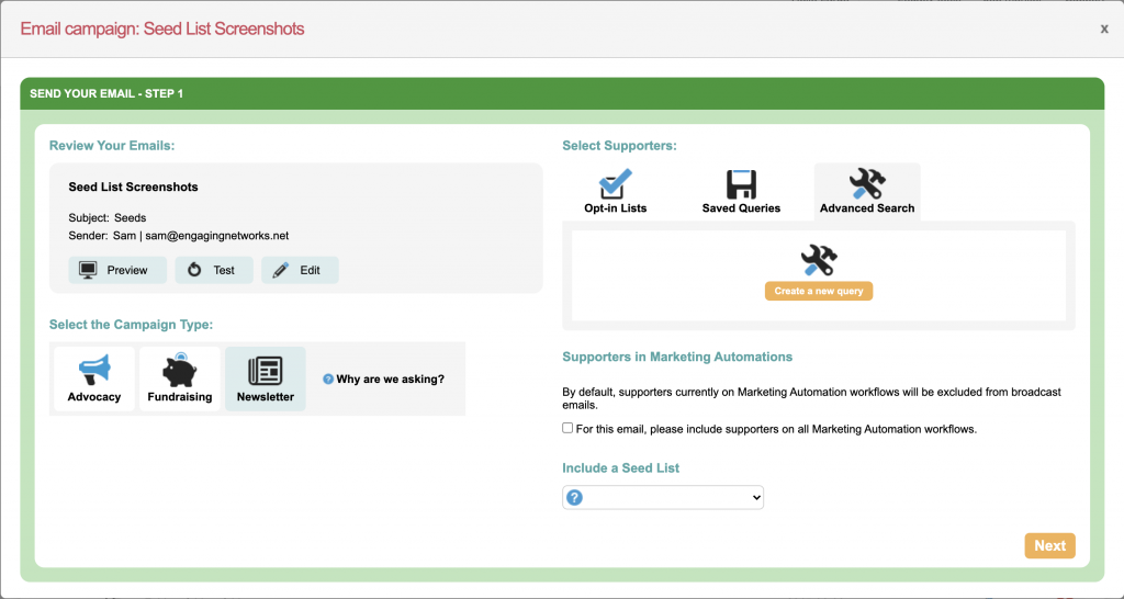 Seeds lists are groups of email recipients who can be added to your Engaging Networks account and subsequently sent emails. The recipients in seed lists will not be added as supporters in the account and do not need to meet the email audience criteria in order to be sent the email. For more information, click here.