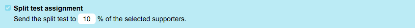 For example, entering 10 means that both versions will be sent to 10% of the entire group you are sending to. If you have two split test messages, then that means 5% of the selected supporters will receive one message and 5% the other message.