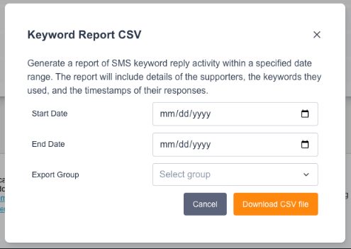 Keyword reporting - keyword level: A downloadable SMS keyword usage report has been added to address the need for more robust keyword reporting. Users will also be able to define the report timeframe for more targeted reports.