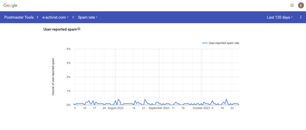 Both Google and Yahoo list spam rates as a critical factor in their upcoming email policy changes, with Google clearly stating that it will “enforce a clear spam rate threshold that senders must stay under to ensure Gmail recipients aren’t bombarded with unwanted messages.” The best place to monitor this will be the Spam Rate Dashboard in Google Postmaster Tools (GPT), which shows the percentage of your emails that Gmail users mark as spam such as here: