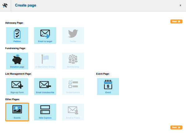 Note that you are on “Page 1” initially. You can have several pages, allowing the supporter to step through the campaign step-by-step. A common set-up for e-card pages is: