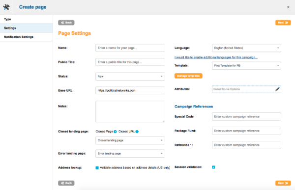 Once you click next, you can optionally set notification settings which will can send you an email when a supporter completes the page. Click Save and the admin screen will close, showing you the Page Builder itself.